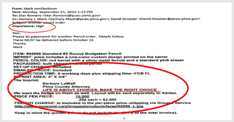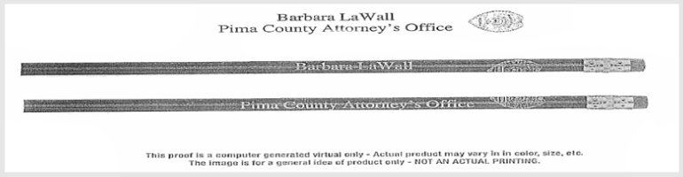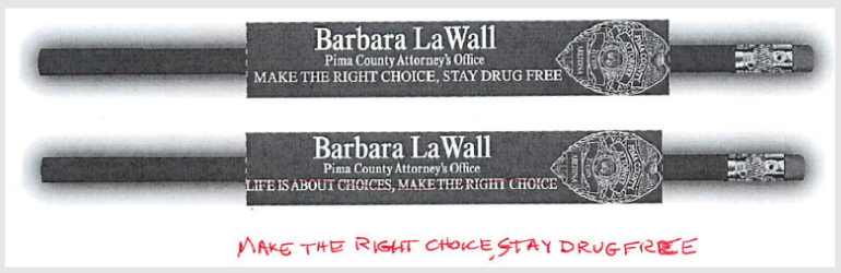 According to documents obtained by the ADI, LaWall used RICO funds for promotional items, as well as standard equipment and supplies. For example, in an email marked “Importance: High” the office placed an order of pencils that were embossed with the message: Barbara LaWall, Pima County Attorney, LIFE IS ABOUT CHOICES, MAKE THE RIGHT CHOICE.