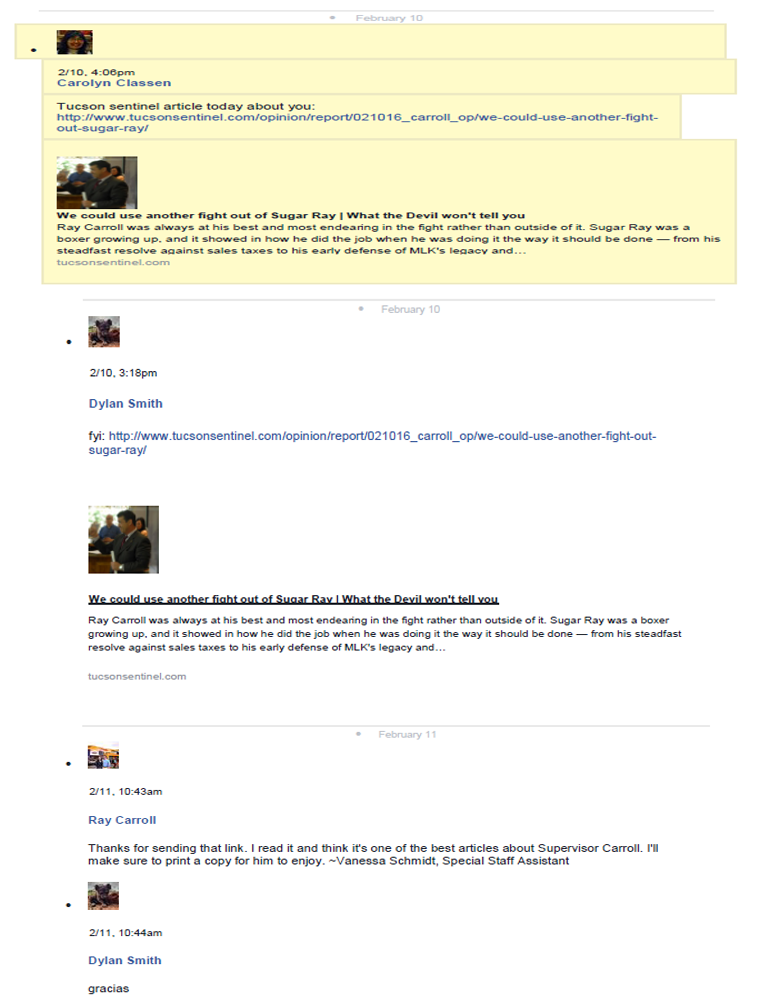 Dubbed “Sugar Ray” by his sycophants at the Tucson Weekly and Explorer, records show that between them and Dylan Smith at the Tucson Sentinel, Carroll has a bevy of writers willing to help him take out Miller, the lone watchdog on the Pima County Board of Supervisors.