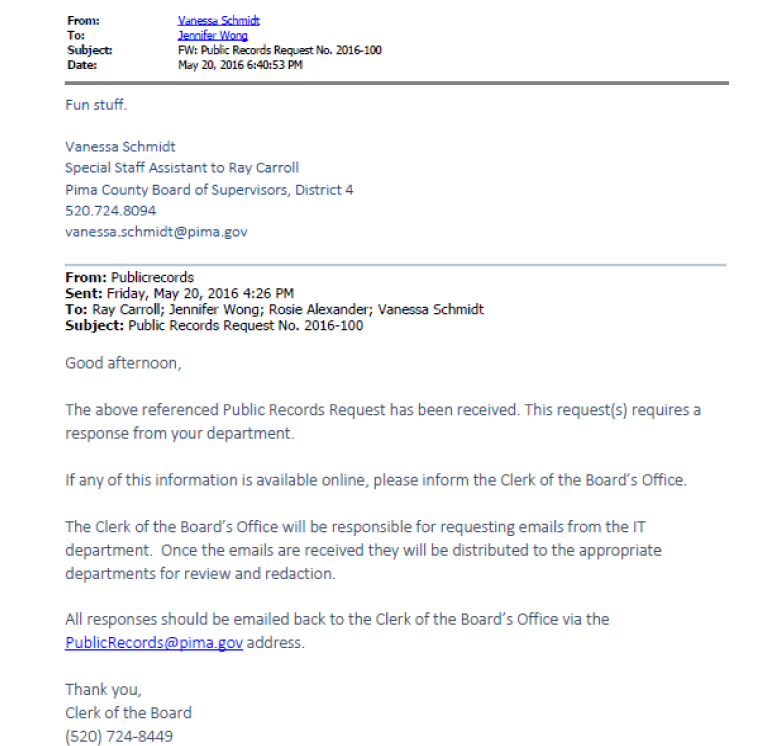 Later, despite the fact that DesJarlais admitted to making a fake news site and denied that Miller had any part in it, Carroll with his stooge Smith continued the attack in a meeting of the Pima County Board of Supervisors. Unfortunately for Carroll, his histrionics fell flat when he claimed that Miller had scrubbed her computers and the director of Pima County’s IT department denied the charge.