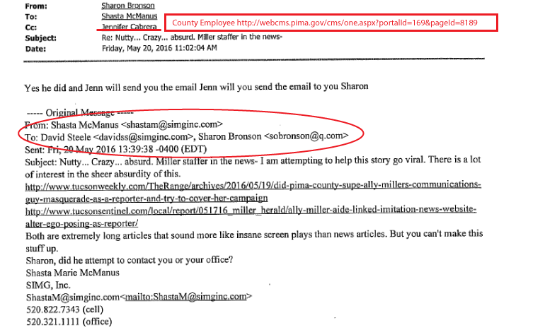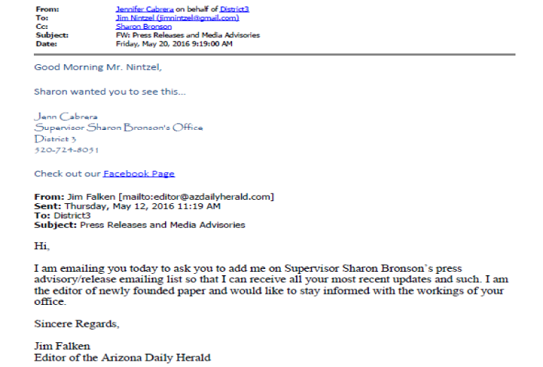 To compound matters, Bronson then sent an email containing one of the articles, sent to her office by Dylan Smith of the Tucson Sentinel, to campaign contributors.