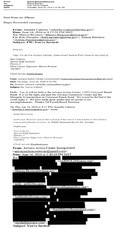 ● In an email dated June 8, 2016, Bronson received an email asking if she would participate in the Arivaca Family and Community Education (AFCE) Candidate Forum on July 9. Bronson’s staff forwarded the invite to Bronson rather than refer the sender to Bronson’s campaign. From June 8 to June 16, emails are exchanged between Bronson’s staff and an event organizer.
