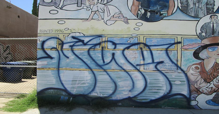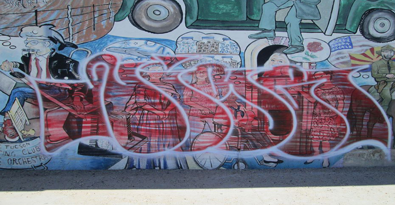 On July 5, 2016 a member of the Fourth Avenue Merchant’s Association reported graffiti over a mural on a business located near N. 4th Ave. and E. 6th St. The graffiti most likely occurred over the 4th of July holiday weekend (between July 1, 2016 – July 4, 2016).