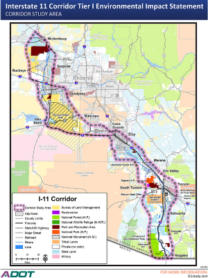 ADOTStudyAREAThat STB meeting, chaired by attorney Si Schorr, adopted the $3 million I-10 Bypass “Major Investment Study” without hearing from even one of the more than 100 people present, leading to a vocal protest with police called in and the meeting recessed.  Finally five people were allowed to voice their opposition, including Saguaro National Park, Arizona Game and Fish, the US Bureau of Reclamation, and two Avra Valley activists.  The vote went unchanged, but no money was available for the study so it went dormant – until I-11.