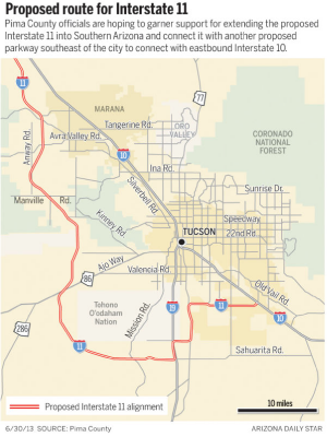 In a May 18 meeting with Avra Valley stakeholders, including this writer, ADOT Project Manager Jay Van Echo said that they would come up with a “couple of dozen lines on a map” but acknowledged that there were really only two choices:  following the existing I-10 corridor or the Avra Valley route proposed by Huckelberry.  ADOT rejected the I-10 alignment six years ago in context of an I-10 Bypass that is virtually identical to the Huckelberry Avra Valley proposal.
