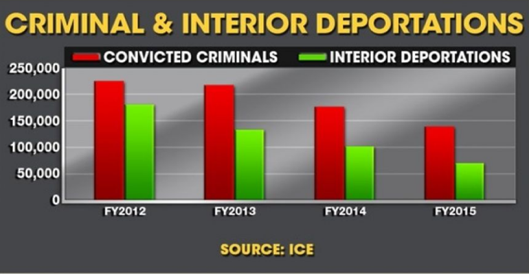 Criminal and Interior Deportations are down significantly. Deportations shrunk 27%, from 86,923 to 63,127 in 2015. Of the Interior Enforcement data, of the 11-15 million illegal immigrants living in the United States fewer than one half of one percent were deported in 2015.