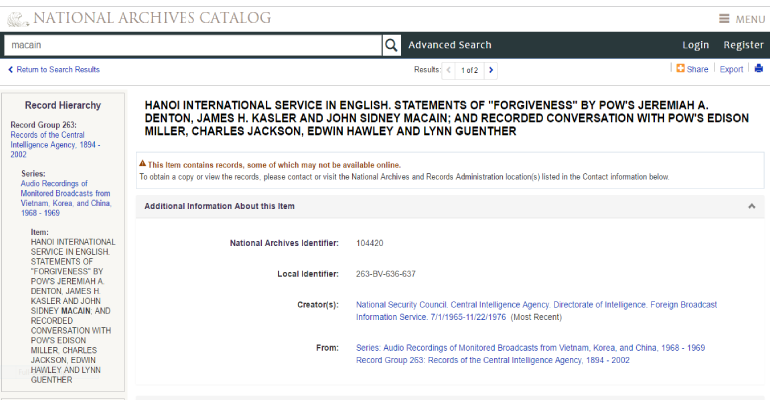 According to numerous reports, the recording of McCain’s propaganda broadcast on North Vietnamese radio in 1969 was captured by the Foreign Broadcast Information Service. The Foreign Broadcast Information Service, which was run by the CIA from 1941-2004, monitored and translated radio broadcasts.