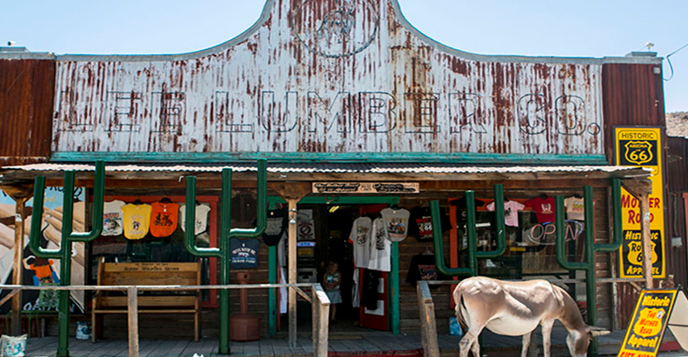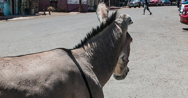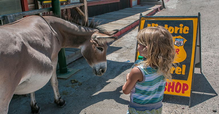 OATMAN, AZ – A wild burro approaches a saloon in the sleepy Arizona town of Oatman, and taps its hooves on the sun-weathered porch. Right on cue, the saloon owner comes out, pats its head and offers it a bite-sized hay cube.