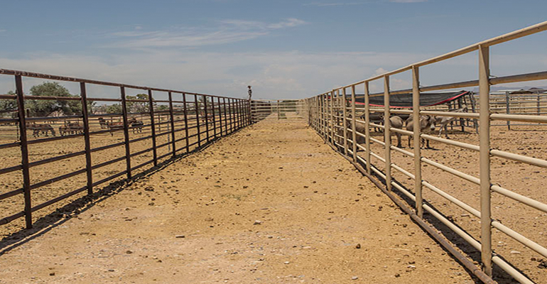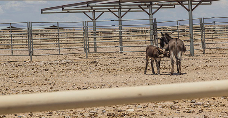 Burros on right and horses on left in BLM holding pens. (Photo by Isabel Menzel/Cronkite News)