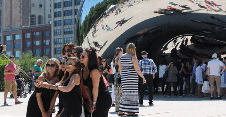A group of millennials take a selfie in front of Cloud Gate, commonly known as “The Bean,” in downtown Chicago. (Photo by Elizabeth Campbell/News21)