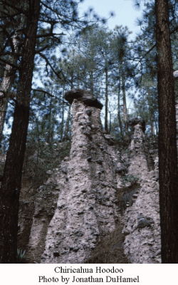 The Chiricahua Mountains of southeastern Arizona where once the site of very explosive volcanic eruptions. They now host some very interesting rock formations including hoodoos, rock spires, and balanced rocks. (All are erosional forms which develop into fantastic pinnacles, towers and grotesques shapes. Hoodoos have a cap rock.)