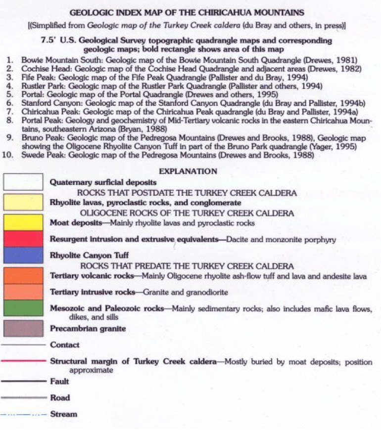 Pallister, J.S., du Bray, E.A., and Hall, D.B., 1997, Guide to the Volcanic Geology of Chiricahua National Monument and Vicinity, Cochise County, Arizona, USGS MAP I-2541