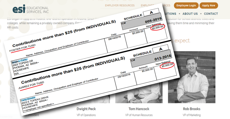 In June, Ms. Foster and Mr. Juarez joined TUSD Board President Mrs. Adelita Grijalva in approving the $21 million contract with ESI, a company out of Phoenix that TUSD is now using to outsource its substitute teachers. In August, Ms. Brooks made the contributions, according to campaign finance records.