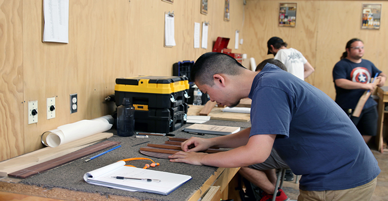 Students build guitars at work stations. The school teaches a craft that fashions guitars from a block of wood to instruments for stage, school auditoriums or homes. (Photo by Joshua Bowling/Cronkite News)