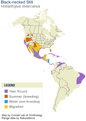 The Black-necked Stilt (Himantopus mexicanus) is a fun bird to watch as it noisily feeds along shorelines. (Listen to sounds). This Stilt occurs in the southern and western U.S. Its range includes the Great Basin, Sonoran and Chihuahuan deserts near bodies of water. The Sonoran Desert, south to the tip of Baja, California Mexico, is within its year-round range. You can see some at the Arizona-Sonora Desert Museum where I took the photograph.black-necked-stilt-range