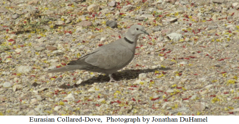 Eurasian Collared-Doves may be mistaken for Ringed Turtle Doves which are slightly smaller and lighter in color. According to the Sibley Guide to Birds, the Ringed Turtle Dove is a domestic variety, not a naturally occurring species, and it fares poorly in the wild.