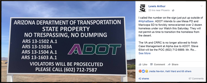 Since ADOT posted their “No Trespassing, No Dumping” sign recently warning homeless veterans and others they are trespassing and that “violators will be prosecuted,” homeless veterans have been immediately cut-off from vital VA assistance because VA personnel and other organizations will not risk being cited or arrested for trespassing, Arthur said.