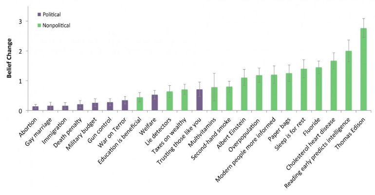 Participants did not change their beliefs much, if at all, when provided with evidence that countered political statements such as, “The laws regulating gun ownership in the United States should be made more restrictive.”