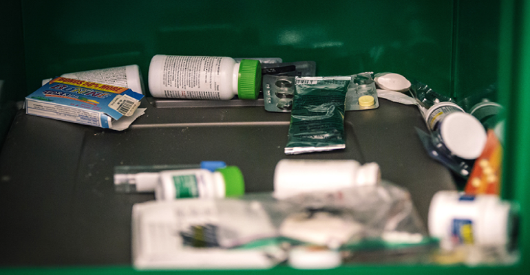 Phoenix police have installed prescription drop-off bins at precincts so people can get rid of unwanted drugs. Officer Joe Bruno and his colleagues must empty the bins once every month. However, he said they empty them about once every week because they fill up too fast. This bin at the Mountain View precinct had just been emptied. (Photo by Ryan Dent/Cronkite News)