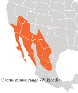 The Cactus mouse ranges from southern California and Nevada, through southern Arizona and New Mexico, west Texas into northern Mexico. They are common in washes and rocky hillsides, in sandy deserts and desert foothills. Depending on location, they may breed throughout the year. A female may produce 3 to 4 litters per year, each with 4 to 5 young.