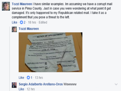 Along with the picture, the Facebook friend wrote: “I have similar examples. I’m assuming we have a corrupt mail service in Pima County. Just in case you were wondering at what point it got damaged. It’s only happened to my Republican related mail. I take it as a compliment that you pose a threat to the left.”