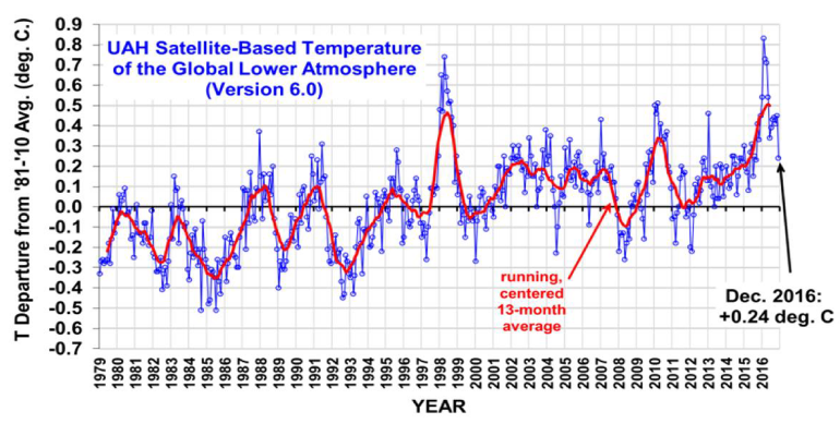 The Earth experienced two super El Ninos recently: 1997/1998 and 2015/2016. It was expected that 2016 would be the hottest year in the satellite record which begins in 1979. It was, but by only 0.02°C over 1998. That is not statistically significant according to Dr. Roy Spencer, keeper of the UAH satellite system data. (The margin of error is 0.1°C, much larger than the difference between the El Nino years.) The graph above shows the UAH results. A separate satellite analysis by Remote Sensing Systems (RSS) came to the same conclusion.