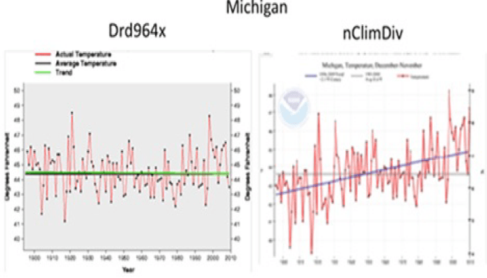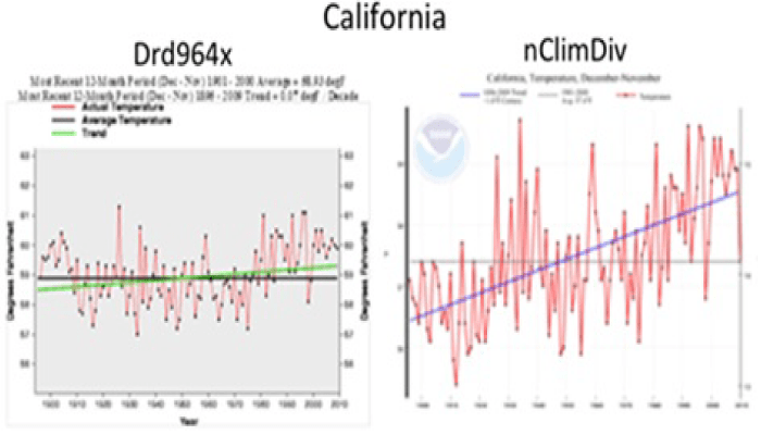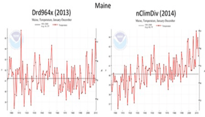 “A 2011 paper announced that NOAA would be transitioning to updated and improved CONUS software around the end of 2013. The program used until the upgrade was called Drd964x. The upgrade was launched from late 2013 into 2014 in two tranches. Late in 2013 came the new graphical interfaces, which are an improvement. Then about February 2014 came the new data output, which includes revised station selection, homogenization, and gridding. The new version is called nClimDiv.” The graphs below show some of the results for temperatures from 1900 to 2010. Left shows old system results versus new system results on right.