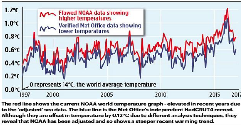 Global temperatures published by NOAA compared to global temperatures published by the British MET office shows that NOAA temperatures are consistently higher. In the graph below (source), the red line shows the current NOAA world temperature graph, which relies on the ‘adjusted’ and unreliable sea temperature data cited in the flawed ‘Pausebuster’ paper. The blue line is the UK Met Office’s independently tested and verified ‘HadCRUT4’ record, showing lower monthly readings and a shallower recent warming trend.