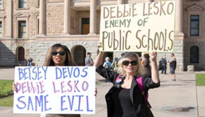 Chanel Powe, a school board member in Balsz, and PJ Cole from Surprise, show off their signs in opposition of Arizona state Sen. Debbie Lesko. (Photo by Josh Orcutt/Cronkite News)