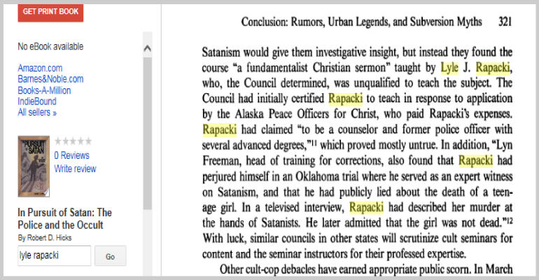 In an Alaska Police Standards Council application for instructor certification, dated 7/21/89, Rapacki lists his college background as “Northern AZ. Univ. 60 hrs. Counseling Psychgology MA., Trinity Bible College, 35 hrs. Pastoral Counseling, M. Div., Northern AZ. Univ. 160 hrs. Political Science, B. S. ” (Alaska Police Standards Council form F-9 APSC Instructor Certificate Application Dated 7-21-89. Signed by Lyle J. Rapacki) He does hold a B. S. in political science from N. AZ Univ. He does NOT hold a M. A. nor a M. Div. as his credentials state.