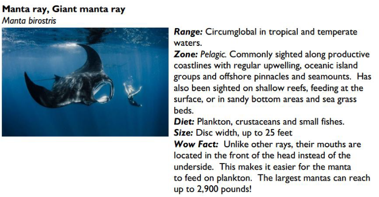 Rays are bottom feeders. “Besides gills, rays have an extra adaptation to help them breathe while resting on the bottom of the ocean. These special openings, which are near their eyes, are called spiracles. Instead of sucking sandy water in through their gills, they can pull clear water in through their spiracles. They then push the water out through their gill slits.” (ASDM)