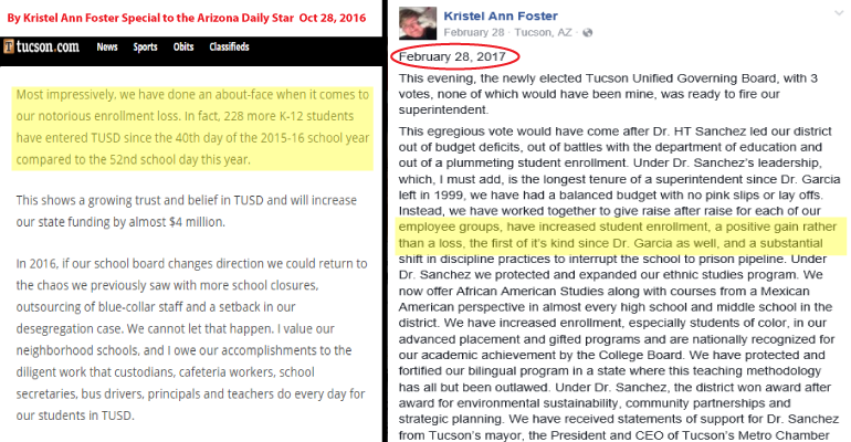 Unfortunately, the District staff may have been honest about the numbers, but Foster was not at all. In an opinion piece in the Star published only days before the election, Foster wrote: “Most impressively, we have done an about face when it comes to our notorious enrollment loss. In fact, 228 more K-12 students have entered TUSD since the 40th day of the 2015-2016 school year compared to the 52nd school day this year.” The fact that Foster specifically states “K-12”, in this quote when she was by her own admission aware that pre-K enrollment was added in as part of the figure, shows intentional misinformation was provided by her in order for her to regain her seat. Any politician who consciously decides to provide voters with misinformation and is found out, as Foster has been, should not be believed again.