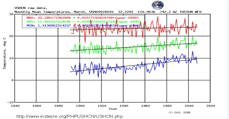Since I wrote the MORE MARCH MADNESS article, I found the old temperatures records from the USHCN station at the University of Arizona. The top red line shows the March high temperature spikes. Not much different from this past March. The rise in average and night temperatures shown by the other lines are consistent with the urban heat island effect.