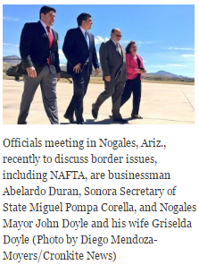 Miguel Pompa Corella emerges from the jet onto the tarmac, immediately being welcomed to the U.S. by Nogales Mayor John Doyle and a small contingent of local leaders and businessmen. Pompa is secretary of state for the northern Mexican state of Sonora, which shares the border with Arizona.
