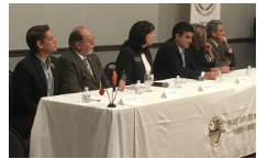 The speakers of the luncheon in Nogales sat at the front oft he room, in front of dozens of guests who attended. From the group at the table, Arizona Sec. of State Michele Reagan (middle) and Miguel Pompa (to Regan’s left) spoke at the event. (Diego Mendoza-Moyers/Cronkite News)
