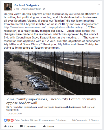 Hicks, the lone Republican on the Board, expected the Board’s vote to mirror the vote by the Pima County Board of Supervisors, which fell along party lines. Surprisingly Rachael Sedgwick posted a message on Facebook praising the two Republican members of the Pima County Board of Supervisors, who had voted against the resolution. Sedgwick then rejected Hicks’ resolution.