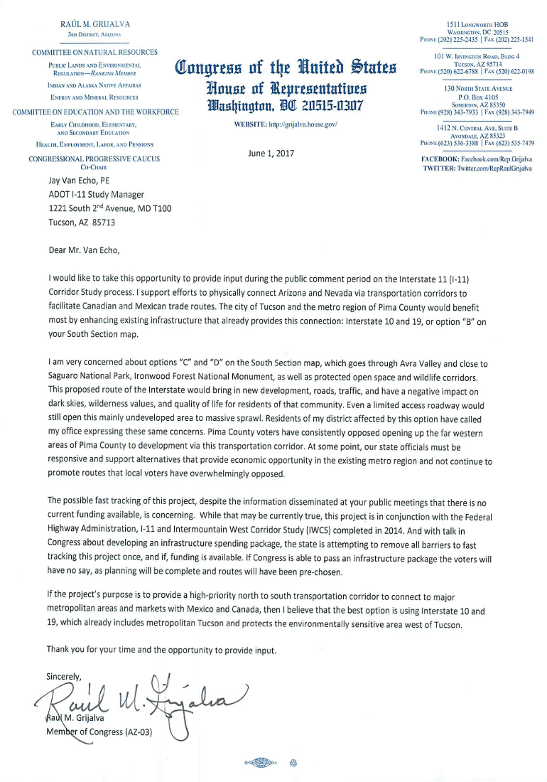 District 3 Congressman Raul Grijalva has publically come out in opposition to building a new highway, Interstate 11, in the Avra Valley west of Tucson. In comments submitted to the Arizona Dept. of Transportation’s I-11 Study Team, Grijalva expressed support for transportation corridors along Interstates 10 and 19, saying this option would “most benefit” Tucson and the Pima County metro region. He noted that the Avra Valley alternative options would have “a negative impact on dark skies, wilderness values, and quality of life for residents of that community.”