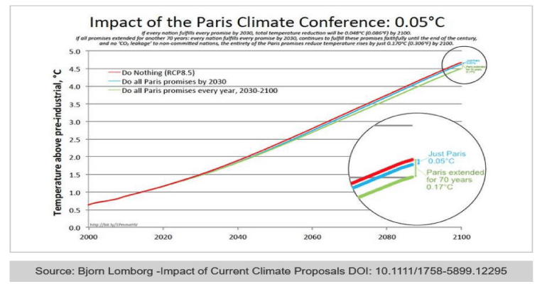 The much touted Paris Climate Accord aims at worldwide reduction of carbon dioxide emissions in order to keep global temperatures from rising more than 2°C above pre-industrial levels. This goal is purely arbitrary and based not upon any physical evidence, but upon the unproven assumption that carbon dioxide emissions play a significant role in global warming. What the Paris Accord really does is to transfer trillions of dollars from industrialized countries, mainly the US, to the sticky-fingered United Nations and to developing nations. It has a very minimal effect on global warming.