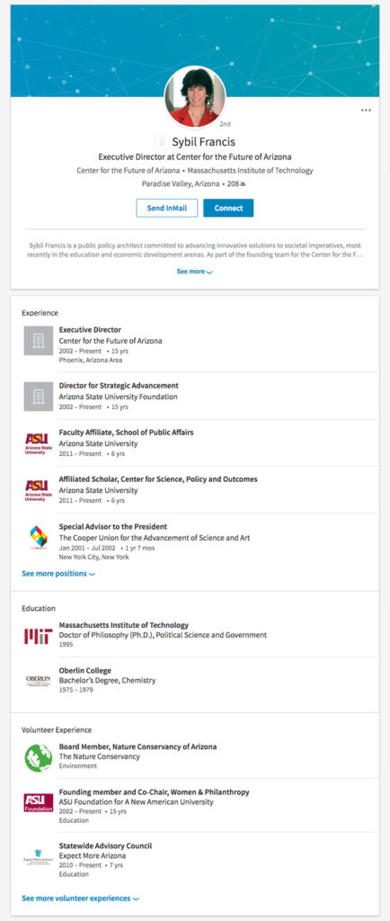 Although Francis’s current biography listed on the Center for the Future of Arizona’s website states she “is engaged in all aspects of the center’s work,” and her LinkedIn profile says she has been executive director of the organization since 2002, she has not been listed as a salaried employee in Center for the Future of Arizona’s tax returns since 2009.