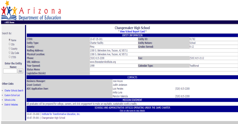“Changemaker High School is a private, not-for-profit 501(c)(3) corporation legally recognized by the Arizona Corporation Commission and the Internal Revenue Service. Changemaker High School is supported with public funds appropriated by the Arizona legislature. The Arizona Charter School Board is the charter authorizer.” “Changemaker High School received a $690,000 federal grant from the Dept. of Education to develop our unique academic program and share our best practices with schools throughout Arizona. During our first year of operation, a research team from the University of Arizona’s Department of Education began a 3-year study to document and participate in the development of our academic program.” |
