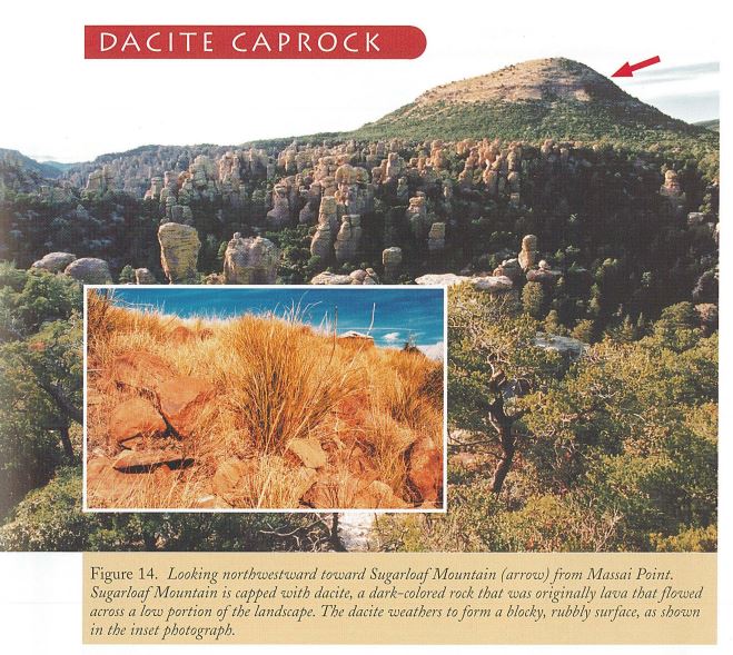 “The landscape of Chiricahua National Monument, like that of much of the Earth’s surface, is a complex mosaic of large and small geologic features. Some of these features were produced by processes that were more active in past geological time but have now slowed or ceased. Other features are the result of past and currently active processes; only a few owe their origin solely to recently active processes. Welded tuff, fiamme, surge beds, fossil fumaroles, and the dacite caprock, for example, were all produced during the eruption of the Turkey Creek caldera, about 27 million years ago. Some joints and spherulites formed as the ash sheet cooled. Other joints and the region’s mountain ranges and intervening basins are the result of Basin and Range faulting during the period 25 to 5 million years ago. Willcox Playa, talus cones, pinnacles, and slot canyons were produced by processes that were more active during the wetter, cooler climate of the glacial epochs from 1.6 million to 10,000 years ago. Tafoni, rock varnish, lichens, case-hardened surfaces, chicken heads, exfoliation shingles, horizontal ribs, solution ponds and the rounded form of the columns are all forming today. Unraveling the evolution of such complex landscapes makes geology a particularly challenging science.” If you are unfamiliar with some of the names of features, read the booklet.