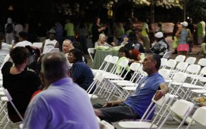 Attendees of the 22nd Annual Candlelight Celebration for Mental Health sit together and, while others line up behind them to enjoy the free food. (Photo by Lysandra Marquez/Cronkite News)