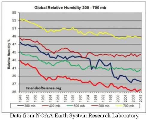 Section 2.6.1 of the report discusses the “greenhouse effect.” They claim: “As increasing GHG [greenhouse gases] concentrations warm the atmosphere, tropospheric water vapor concentrations increase, thereby amplifying the warming effect.” Climate models depend on this assumption. But NOAA’s own data show that global humidity has been decreasing with warming.