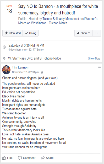 Elías stated in a press release, “Steve Bannon had done nothing deserving of an award and the bigotry of his publications and positions is not welcome in Pima County. His long record of demeaning and scapegoating minorities – immigrants, LGBTQ, women, Jews, people of color – is highly offensive and should be denounced, not celebrated.” as the focus of the protest.”