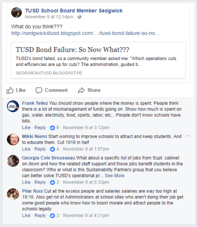 Why should the Governing Board pay our office managers as though they are our most precious resource when the people who bring our students–the reason TUSD exists at all—to school every morning, afternoon, and sometimes on evenings and weekends are egregiously underpaid? Longevity is important. It is most important for our students, our teachers, and our site leaders. And until the board sets the budget with equity and fairness to ALL, to promote the longevity of our truly most important employees–those who work with children and in the schools–I will do all I can to lower the salaries of the overpaid.