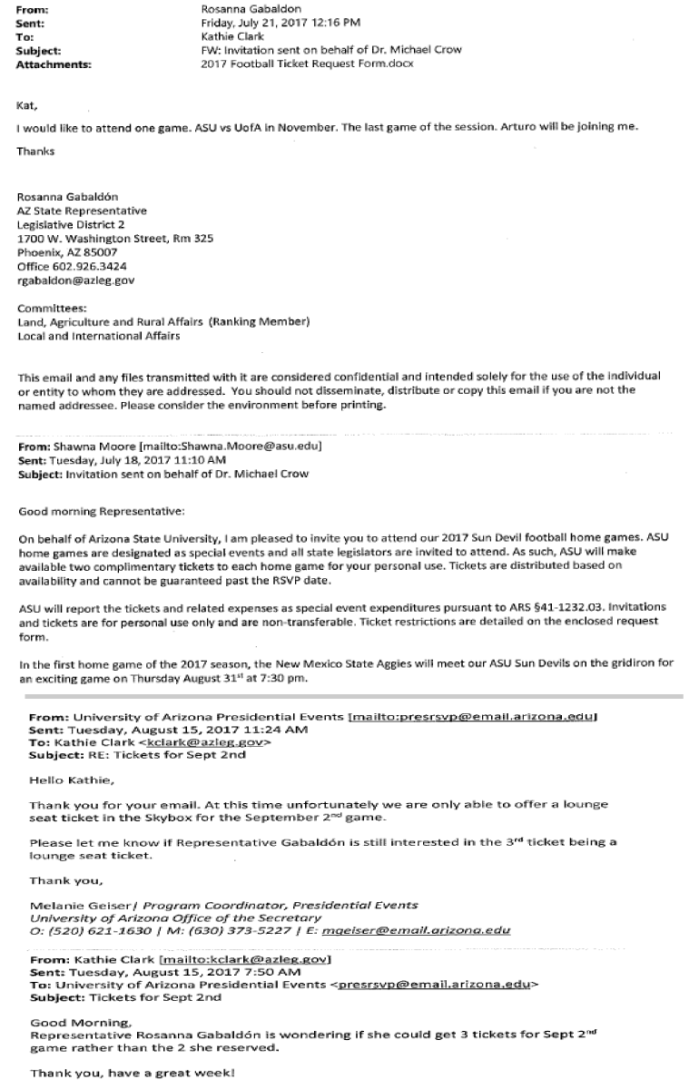 Some legislators like Rep. Rosanna Gabaldon, a democrat out of LD2, are more eager to snatch them up than others. Emails produced in response to a records request by the Arizona Daily Independent in its investigation of a “trade mission” to Mexico earlier this year, show that Gabaldon is a fan of the Wildcats.