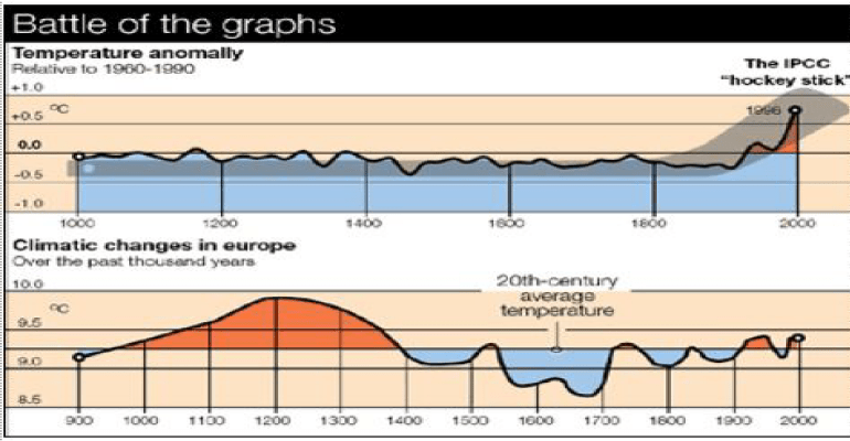 Part of the controversy involved the infamous “hock stick” graph devised by Michael Mann of Penn State and subsequently adopted by the IPCC.