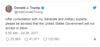 “After consultation with my Generals and military experts, please be advised that the United States Government will not accept or allow… Transgender individuals to serve in any capacity in the U.S. Military,” his three-part July 26 tweet said. “Our military must be focused on decisive and overwhelming…victory and cannot be burdened with the tremendous medical costs and disruption that transgender in the military would entail. Thank you.”