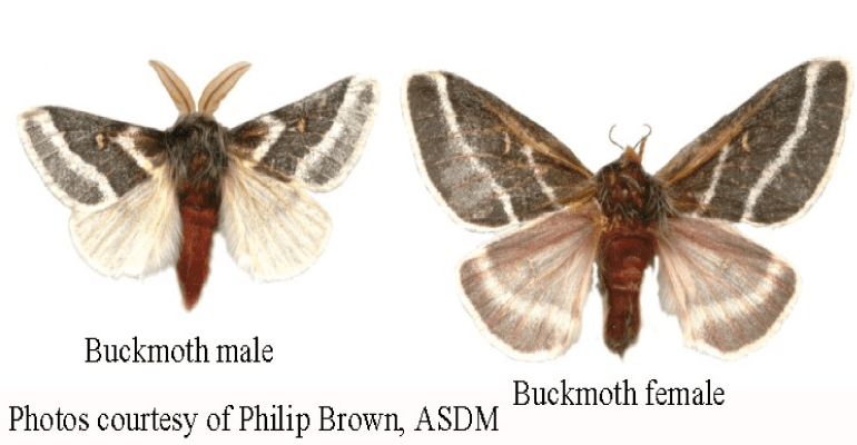 Buckmoths (genus Hemileuca, several species) are found across southern Arizona, New Mexico, and Texas, and south through Sonora and Chihuahua, Mexico. Habitat varies from mesquite bosques to grasslands and plains, depending on the species. They feed on the leaves of palo verdes, mesquites, and other desert trees. The spines of the caterpillars can release a very painful toxin, so don’t touch them. See photos of the moth here.