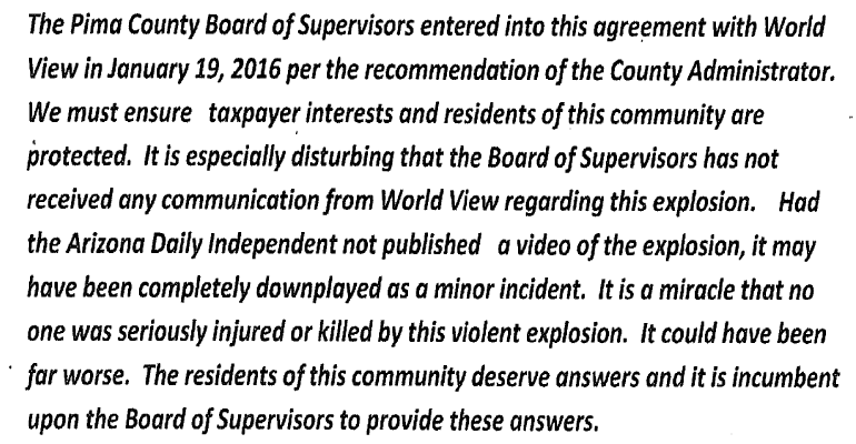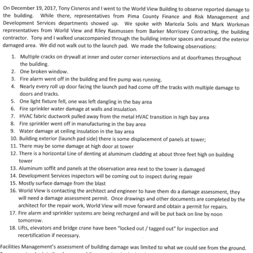 This report will be made available to Pima County for our information and comment. World View staff and personnel have always demonstrated a significant commitment to safety and professionalism, in particularly how they have handled this incident. We very much appreciate having an innovative aerospace company such as World View call Tucson home.