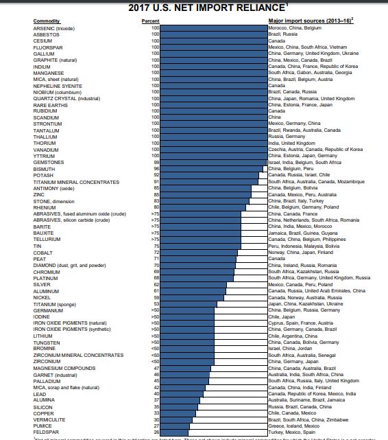 The US Geological Survey report shows that the U.S. is 100% reliant on imports for 22 minerals.